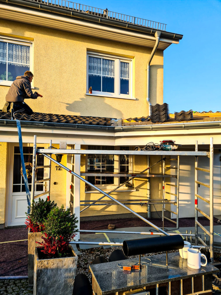 Im Biesdorfer Schmetterlingsviertel wurde mir die Aufgabe gestellt ein Vordach zu entwerfen und herzustellen. Die Schwierigkeiten dabei waren wenige rechte Winkel, angleichen der Dachkonstruktion an eine bestehende Garage. Ausgeführt habe ich die Fundamente, die Holzkonstruktion als auf die Eindeckarbeiten. Die Klempnerarbeiten hat mein Freund Sven Jänicke ausgeführt.