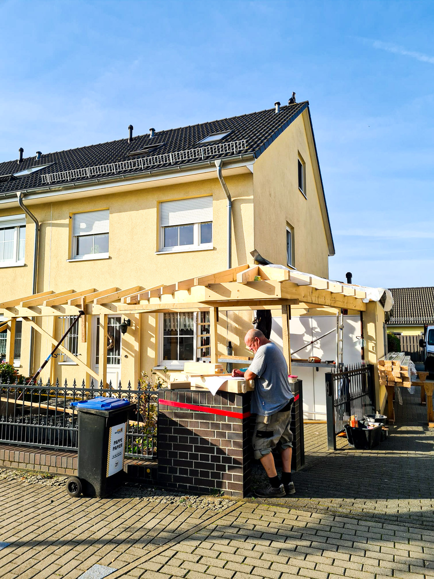 Im Biesdorfer Schmetterlingsviertel wurde mir die Aufgabe gestellt ein Vordach zu entwerfen und herzustellen. Die Schwierigkeiten dabei waren wenige rechte Winkel, angleichen der Dachkonstruktion an eine bestehende Garage. Ausgeführt habe ich die Fundamente, die Holzkonstruktion als auf die Eindeckarbeiten. Die Klempnerarbeiten hat mein Freund Sven Jänicke ausgeführt.