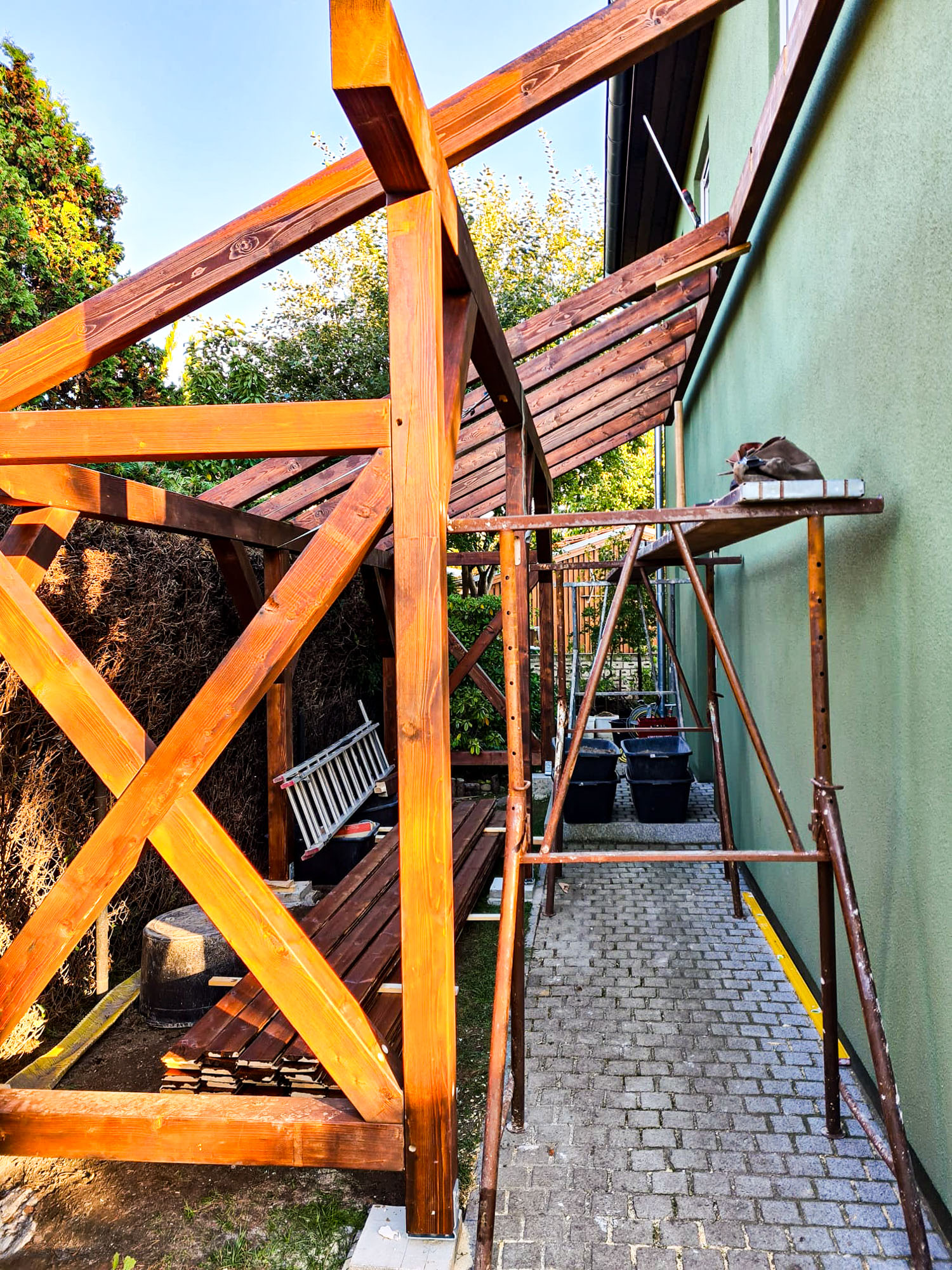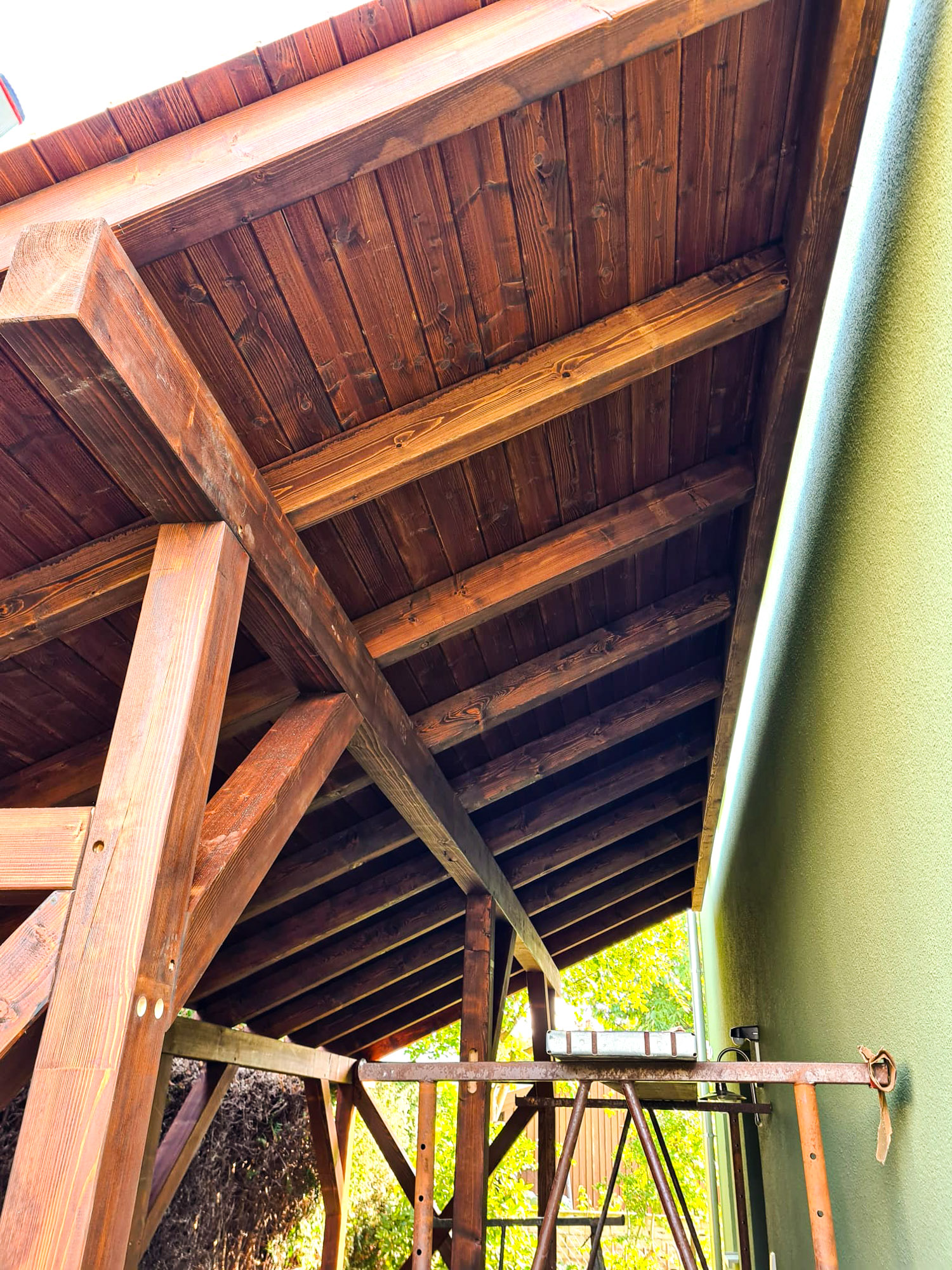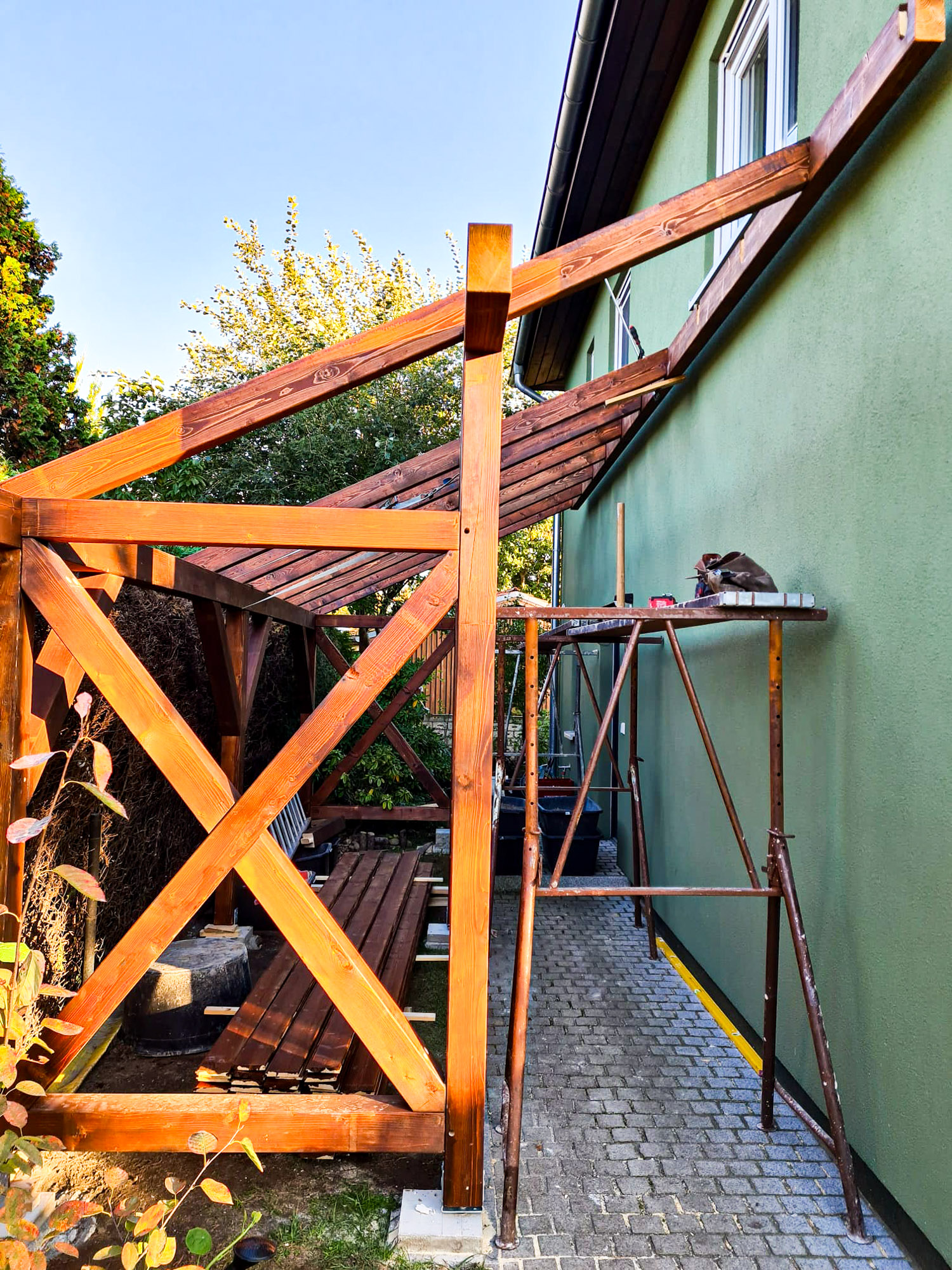 Ein mit mir befreundetes Pärchen kam auf mich zu, ihnen ein Vordach mit Unterstellmöglichkeit für Fahrräder zu entwerfen und zu bauen. Ausgeführte wurden an diesem Vordach außer den Zimmererarbeiten die Gründungen für die Fundamente sowie die Klempner- und Dachdeckerarbei